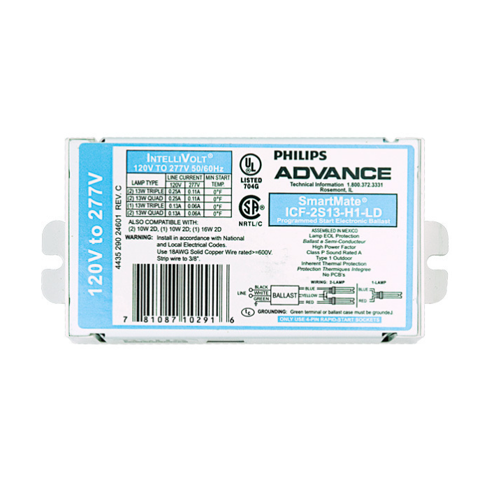 Advance SmartMate Electronic Compact Fluorescent (CFL) Ballast - Lamps: (1/2) 10/13 Watt (1) 16 Watt 4-Pin -Input:120-277V -Starting: Instant Start
