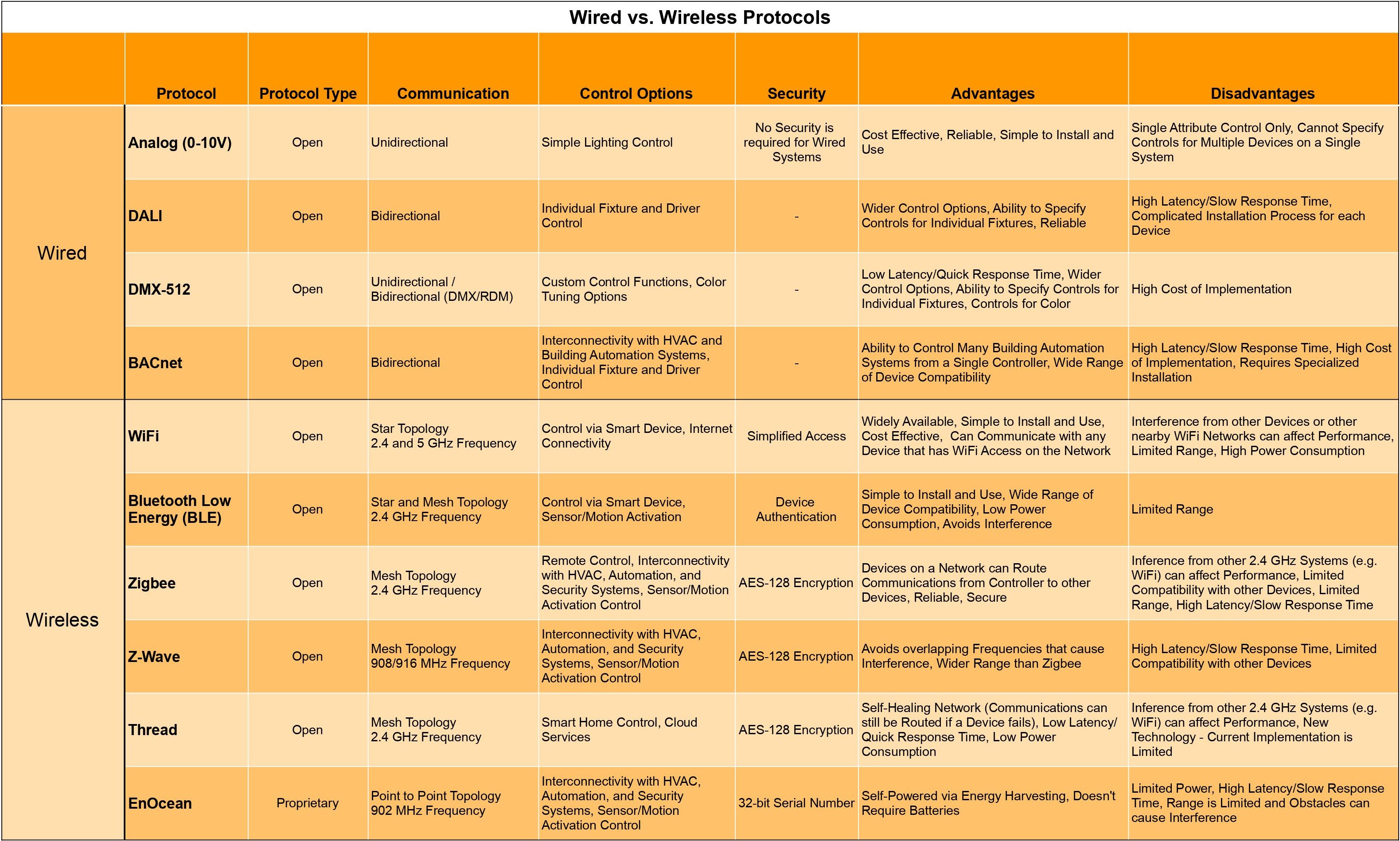 Wireless - Wireless receivers are able to operate on the signals from multiple standard protocols. This is well suited for applications with new luminaires or where installing wiring is difficult or costly. Common standard protocols include Bluetooth, WiFi, Zigbee, and EnOcean.